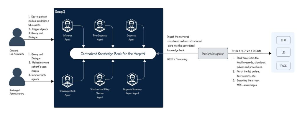 DeepQ addresses the above challenges through its deep contextual intelligence, real-time updated centralized knowledge bank, pre-built specialized agents designed for clinicians, and robust permission-aware capabilities.